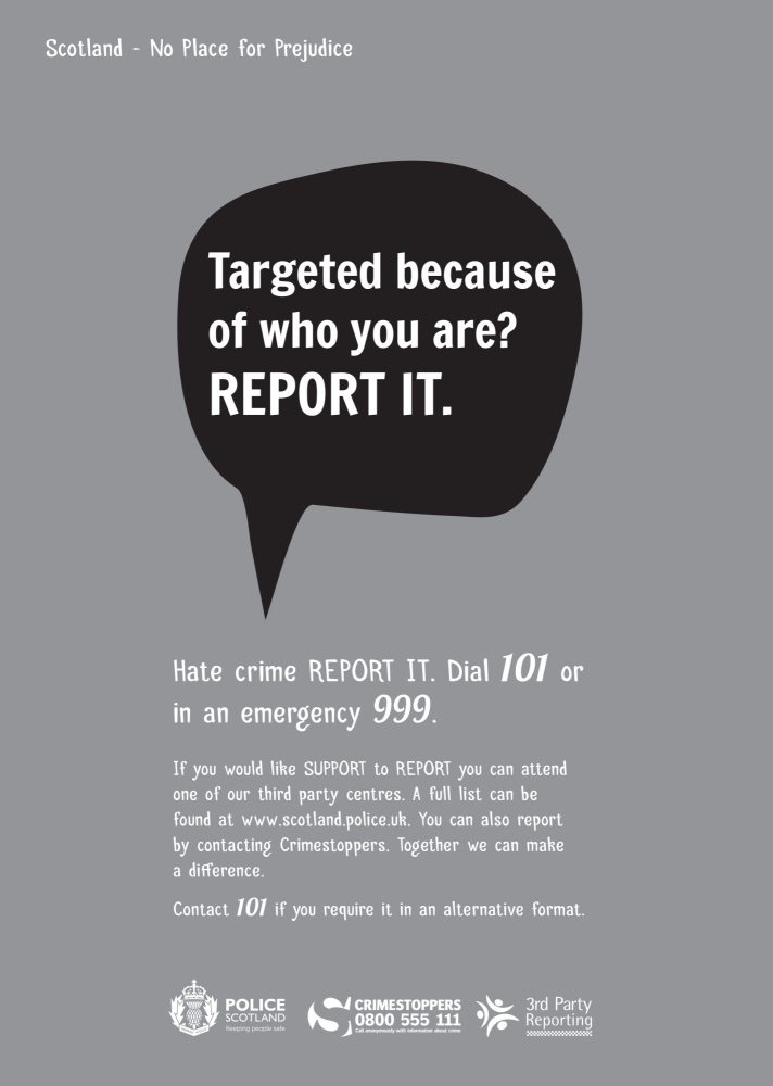 If you feel that you are experiencing any type of hate speech or behaviour, then you can report it at either a Police station or a third party centre. You can find a full list of third party centres by clicking the button below.