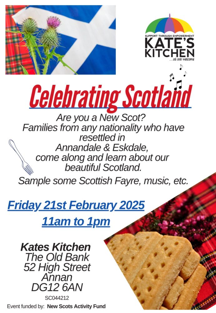 Families of any nationality who are resettled in Annandale and Eskdale are invited to Kate’s Kitchen, Annan, to learn more about Scotland.